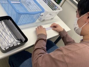 セロハンテープを2個入れ終わると透明なテープを剥がしてもらい