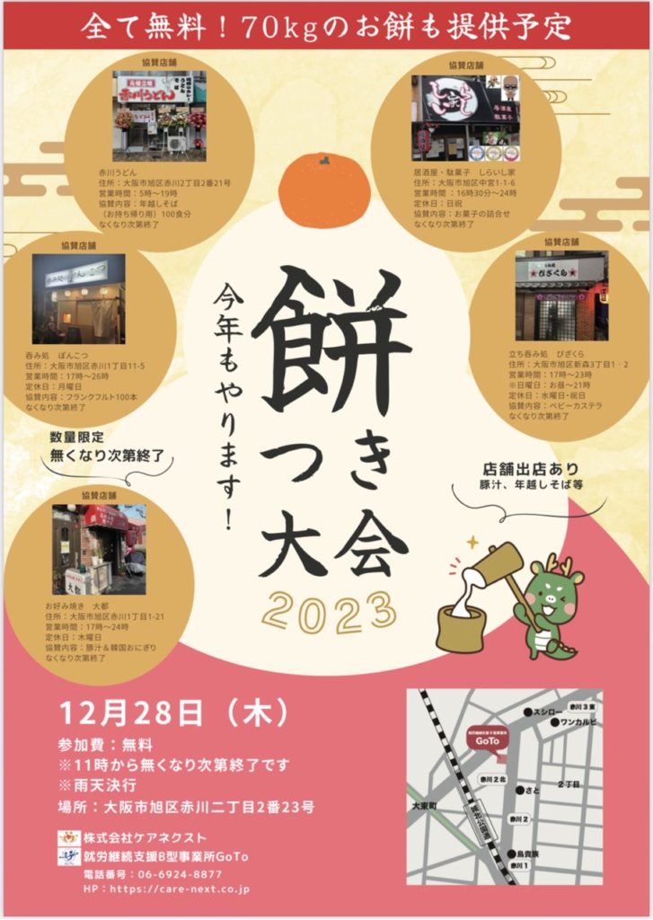 こんにちは♪ 🌟就労継続支援B型事業所GoToです🌟 いきなりですが、今年もやります!!!!! お餅つき大会2023👏👏👏 お餅70kgを御用意しております! 12月28日(木)1[...]