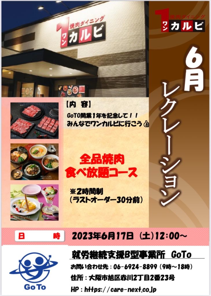 こんにちは 🌟就労継続支援B型事業所GoToです🌟 6月のレクレーションは、利用者様のリクエストに応え、6月17日(土)に、同じ旭区赤川にあるワンカルビに行く事にしました\(^o^[...]