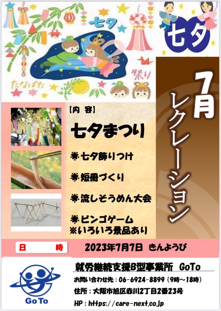 こんにちは 🌟就労継続支援B型事業所です🌟 7月のレクレーションのお知らせです。 ちょうど7日が金曜日でしたので、そのまま七夕まつりをします🎵 ことしはある程度大きな笹の葉を準備し[...]