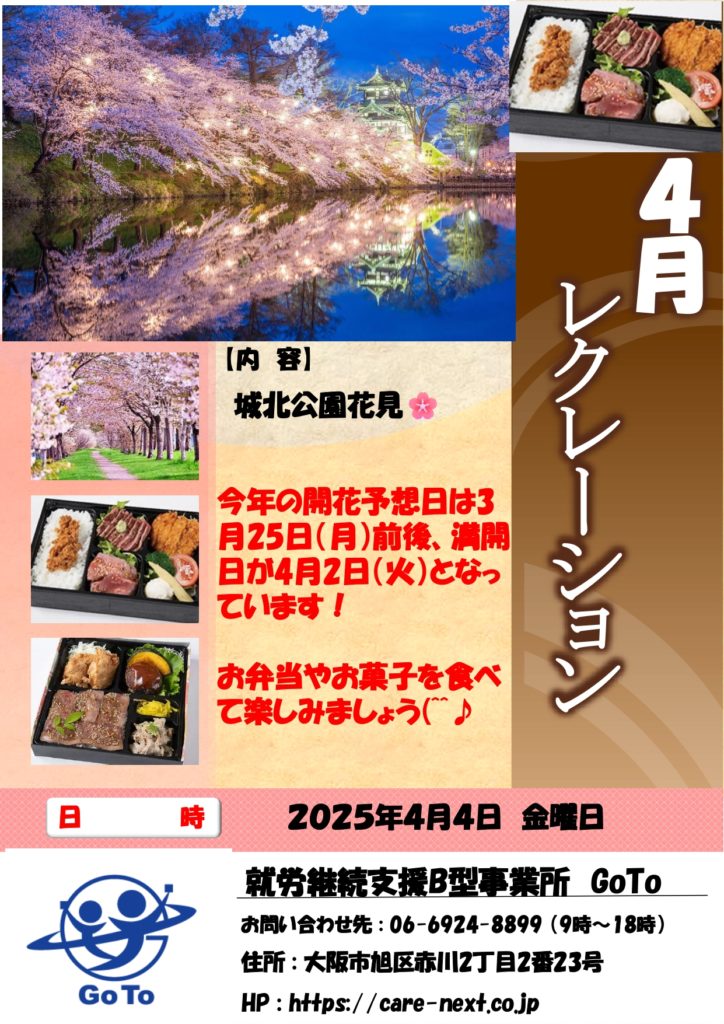 🌟就労継続支援B型事業所 GoToです🌟 また週末は気温が下がるみたいですが、いよいよ春の到来ですね🎵 来月のレクレーションですが、去年咲いてなく桜🌸のない花見でしたが今回は期待が[...]