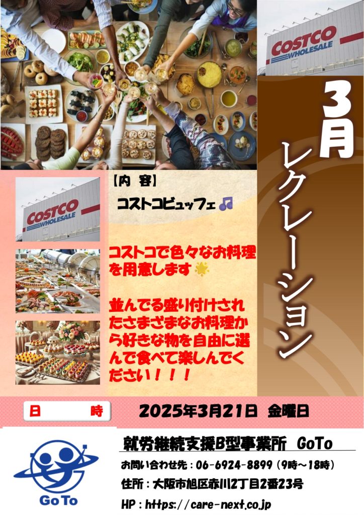 🌟就労継続支援B型事業所 GoTo/SMILE-UP.です🌟 3月のレクレーションです🎵 今回はSMILE-UP.のパクリでコストコビュッフェ🍴を行います!!! テーブルの上に様々[...]