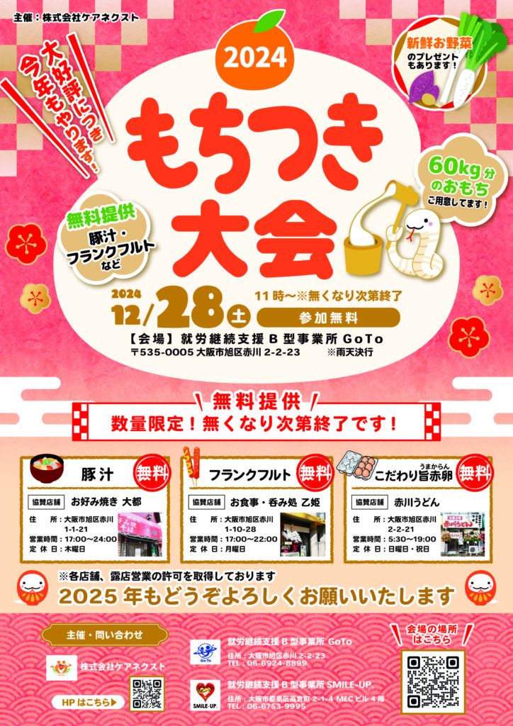 🌟就労継続支援B型事業所GoTo/SMILE-UP.です🌟 今年もケアネクストお餅つき大会を開催いたします👏🎍 12月28日(土)11時〜 60キロのお餅と新鮮野菜のプレゼント!![...]