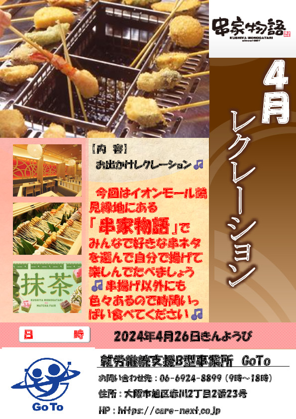 🌟就労継続支援B型事業所 GoToです🌟 先日、毎月恒例イベント、GoToレクリエーションで鶴見区のイオンにある串カツ物語さんに行ってまいりました😎😎 車4台を使い、移動の車中から[...]